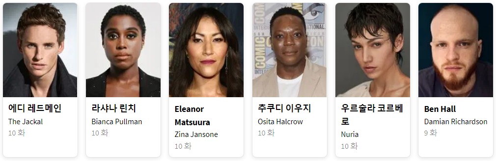 한편, 영국 정보국의 **비앙카 풀먼(라샤나 린치)**은 자칼의 행적을 포착하고, 자신의 총기 전문 지식을 활용해 그의 뒤를 추적합니다. 비앙카는 자칼의 냉혹한 본성과 교묘한 변장을 파헤치며, 유럽 전역에서 쫓고 쫓기는 스릴 넘치는 추격전이 벌어집니다.